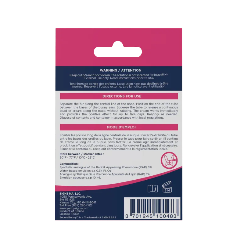 La crème agit immédiatement et produit un effet positif pendant 5 jours. Renouvelez l'application si nécessaire pour maintenir un environnement positif. SecureBunny Adventure agit en utilisant la chaleur corporelle naturelle du lapin pour diffuser la phéromone dans son environnement immédiat. Formulé avec la phéromone synthétique du lapin, SecureBunny Adventure n'a aucun effet sur les autres animaux.