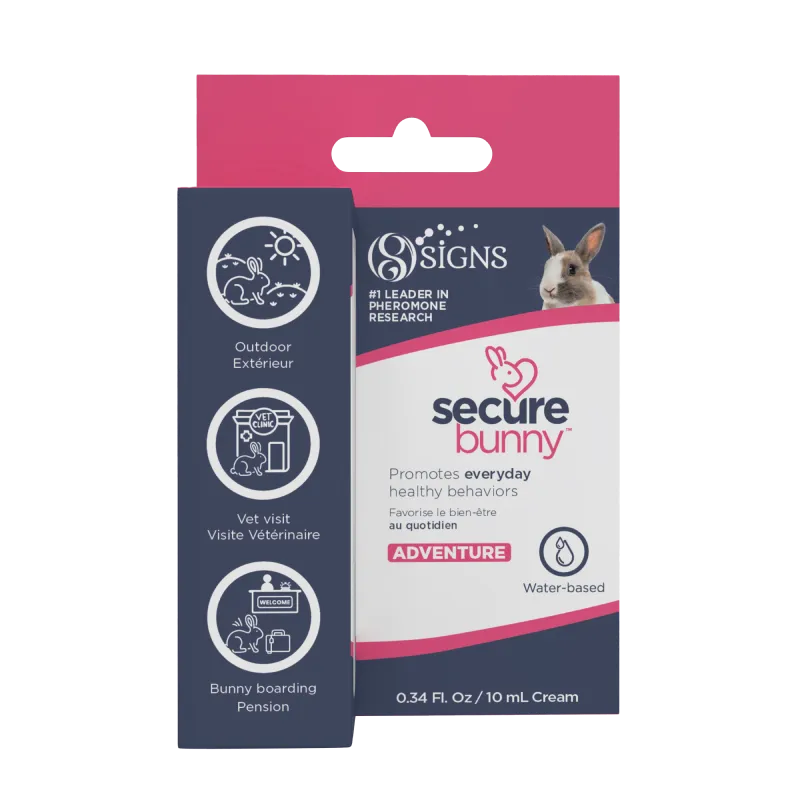 SecureBunny Adventure a été testé sur différents lapins de compagnie et aucune réaction cutanée ou allergique n'a été signalée. SecureBunny Adventure est une émulsion brevetée unique à base d'eau libérant la phéromone apaisante pour lapin.